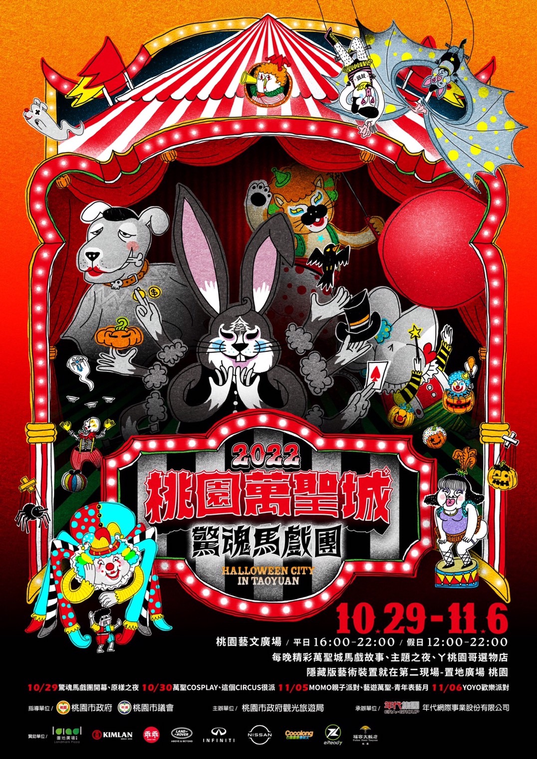 2022桃園萬聖城今年主展區在桃園藝文廣場(中正藝文特區),佈展設計以寵物和馬戲團表演為發想打造『驚魂馬戲團』主題風格讓萬聖節慶充滿搞怪卻又可愛,一連串的活動讓你嗨翻萬聖節!
